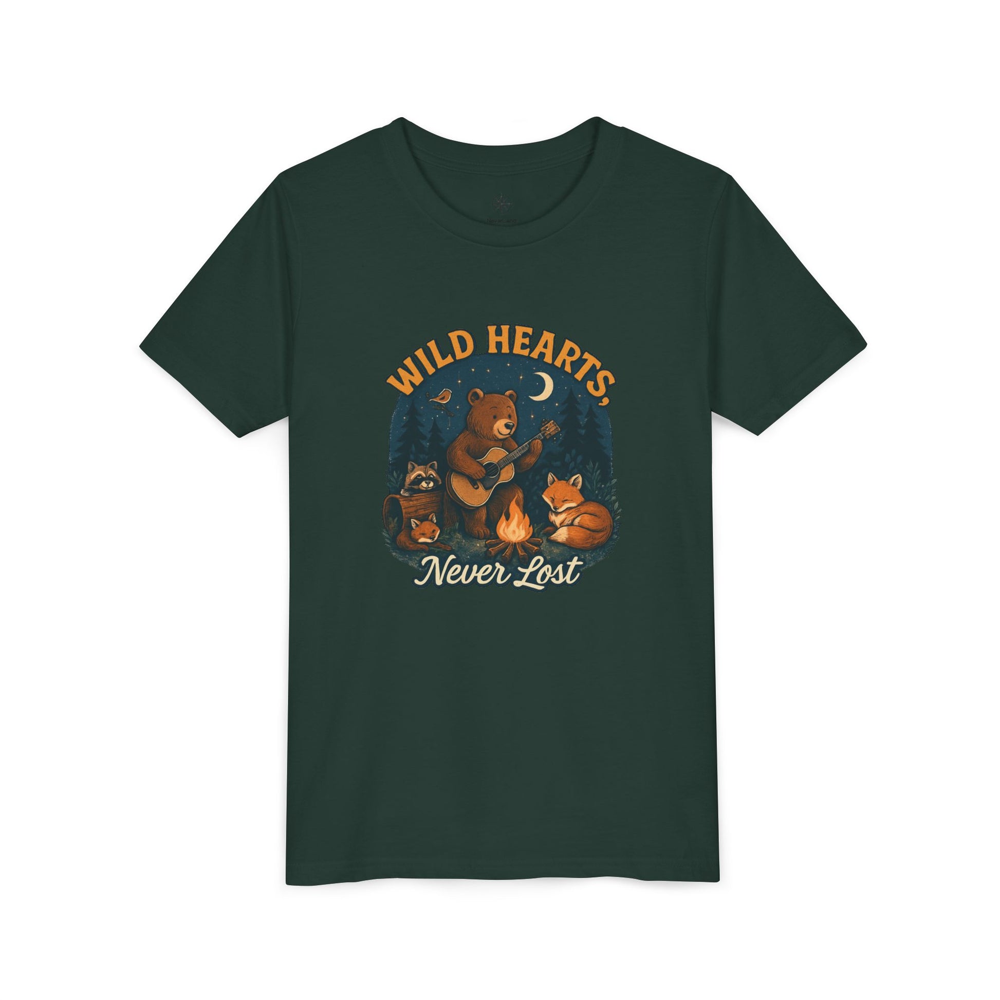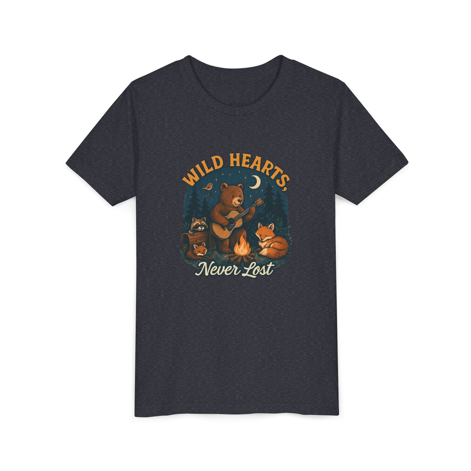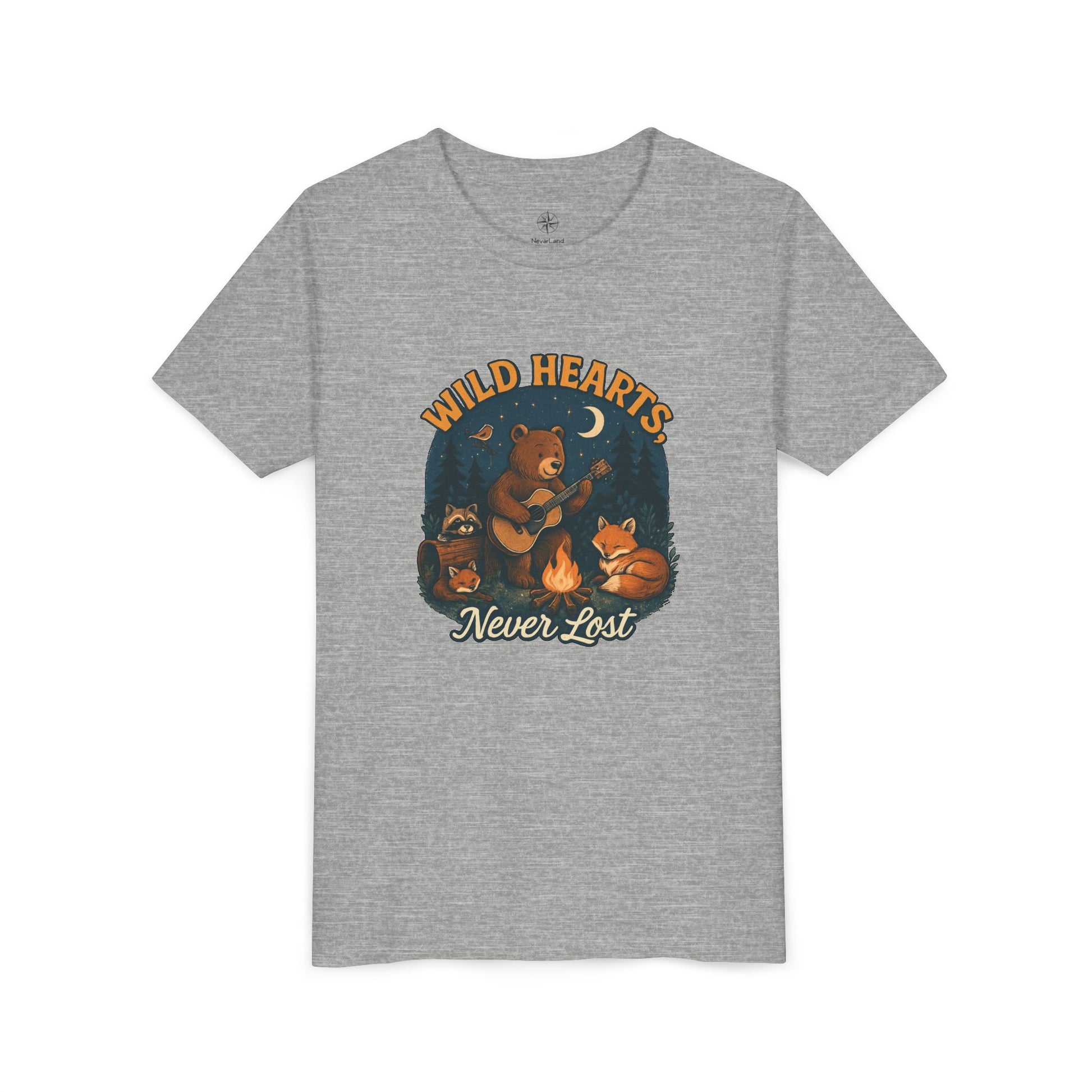 Youth Tee — Wild Hearts Never Lost Campfire Bear Kids Shirt